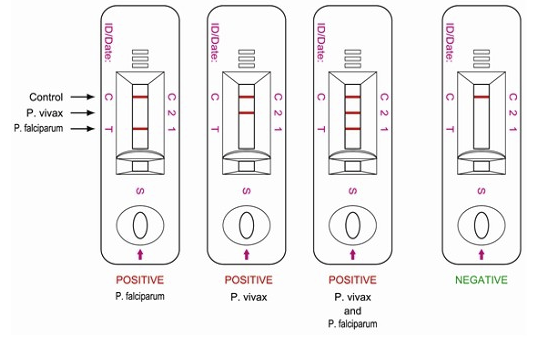 三条测试线都出现,表明恶性疟原虫和间日疟原虫都为阳性。