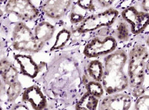 多聚甲醛固定,石蜡包埋(人肾组织);用柠檬酸钠缓冲液(pH6.0)煮沸15min提取抗原;用3%过氧化氢阻断内源过氧化物酶20分钟;阻断缓冲液(正常山羊血清)37℃30min;用(Baxβ)P抗体孵育。未结合的多克隆抗体在1:400下在4°C下过夜,然后根据SP试剂盒(兔子)说明和DAB染色进行操作。